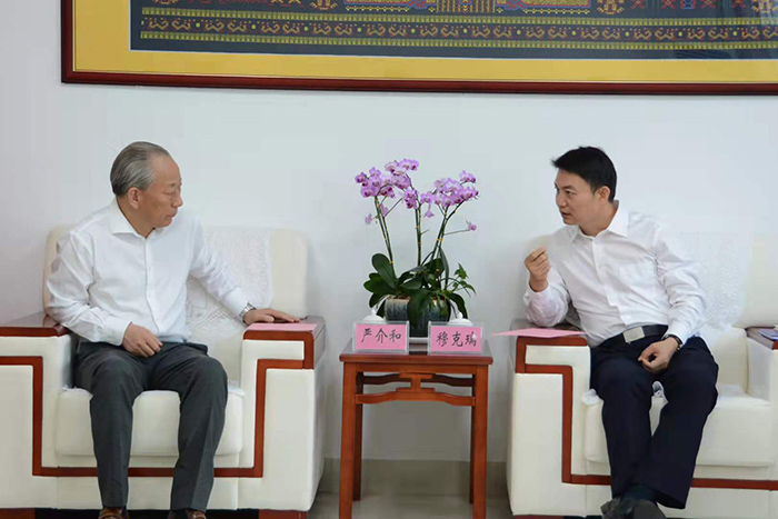 11月1日,,,,,,严介和理事长应邀同海南省保亭县委书记穆克瑞谈判,,,,,,双方就开展地企合作等问题举行了交流。。。。。庄重建设董事局主席金亮、地球村建设董事局主席胡童全程陪同。。。。。